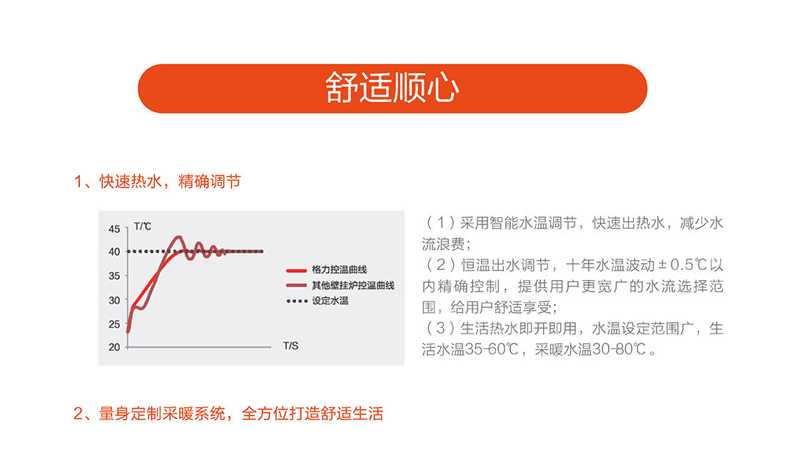 充分燃燒效率達到90%以上,采用智能水溫調節,快速出熱水,減少水流浪費,恒溫±0.5℃以內精確控制,生活水溫度35-60℃,采暖水溫30-80℃。